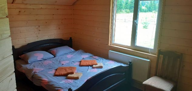 Двоспальне ліжко, шафа для одягу, столик, телевізор в залі, санвузол в номері.
